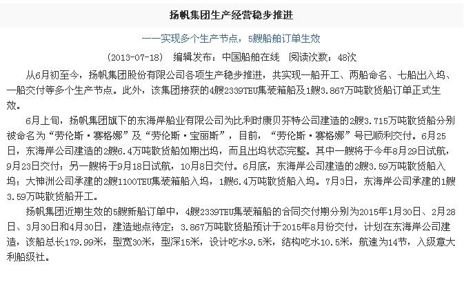 中國船舶在線:揚帆集團生產經營穩步推進